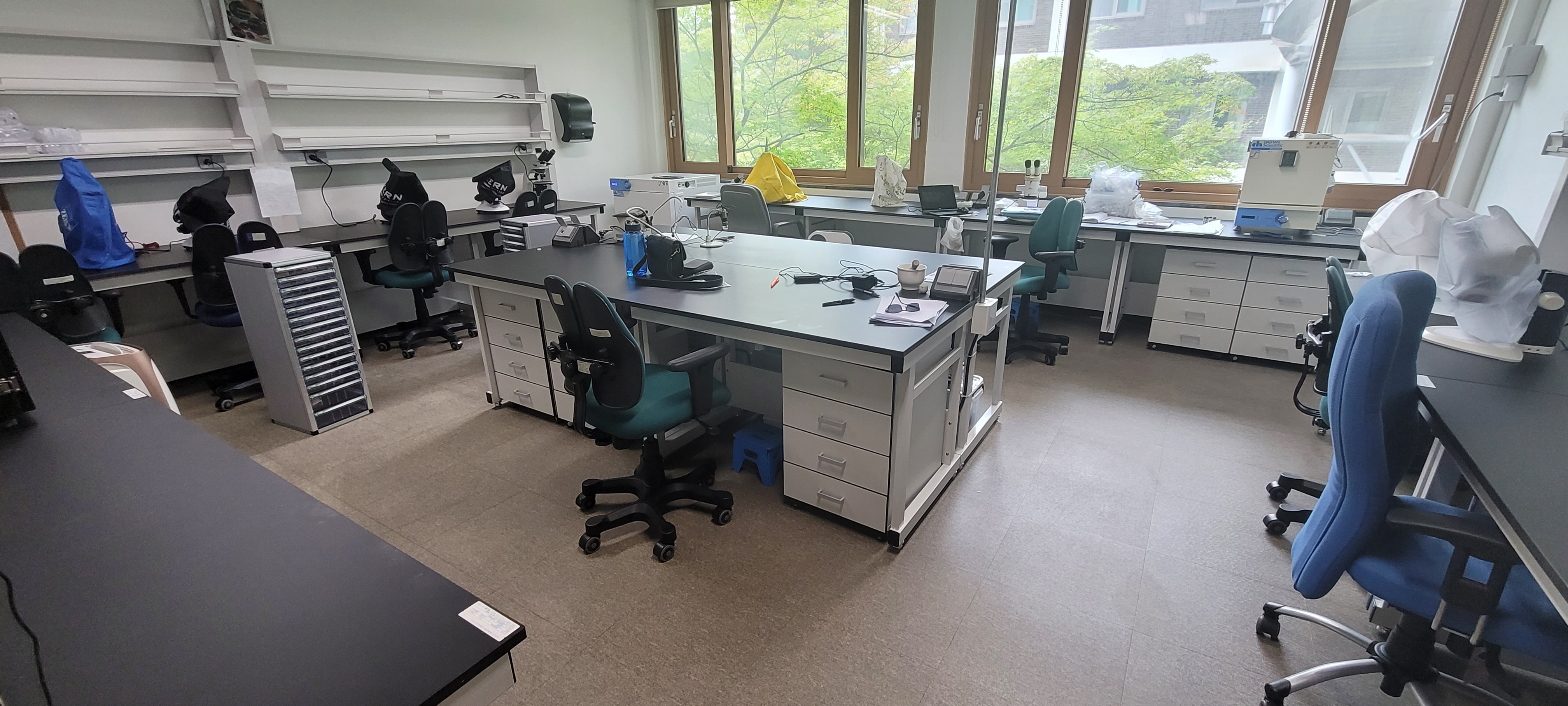The prep lab space is set up for phytolith and diatom extraction, with the possibility for other SOPs such as isotopic and geochemical preparation. Additional methods can be discussed as needed and protocols and materials put in place. Currently the lab hosts a fume hood, chemical cupboards for flammables, irritants/environmental hazards and corrosives, as well as fridge-freezer for chemicals and samples. The labs have muffle furnace and oven capacity, as well as drying cabinets to ensure samples and chemical processes can be carried out safely and as needed. The lab is monitored by SNU SAFE.